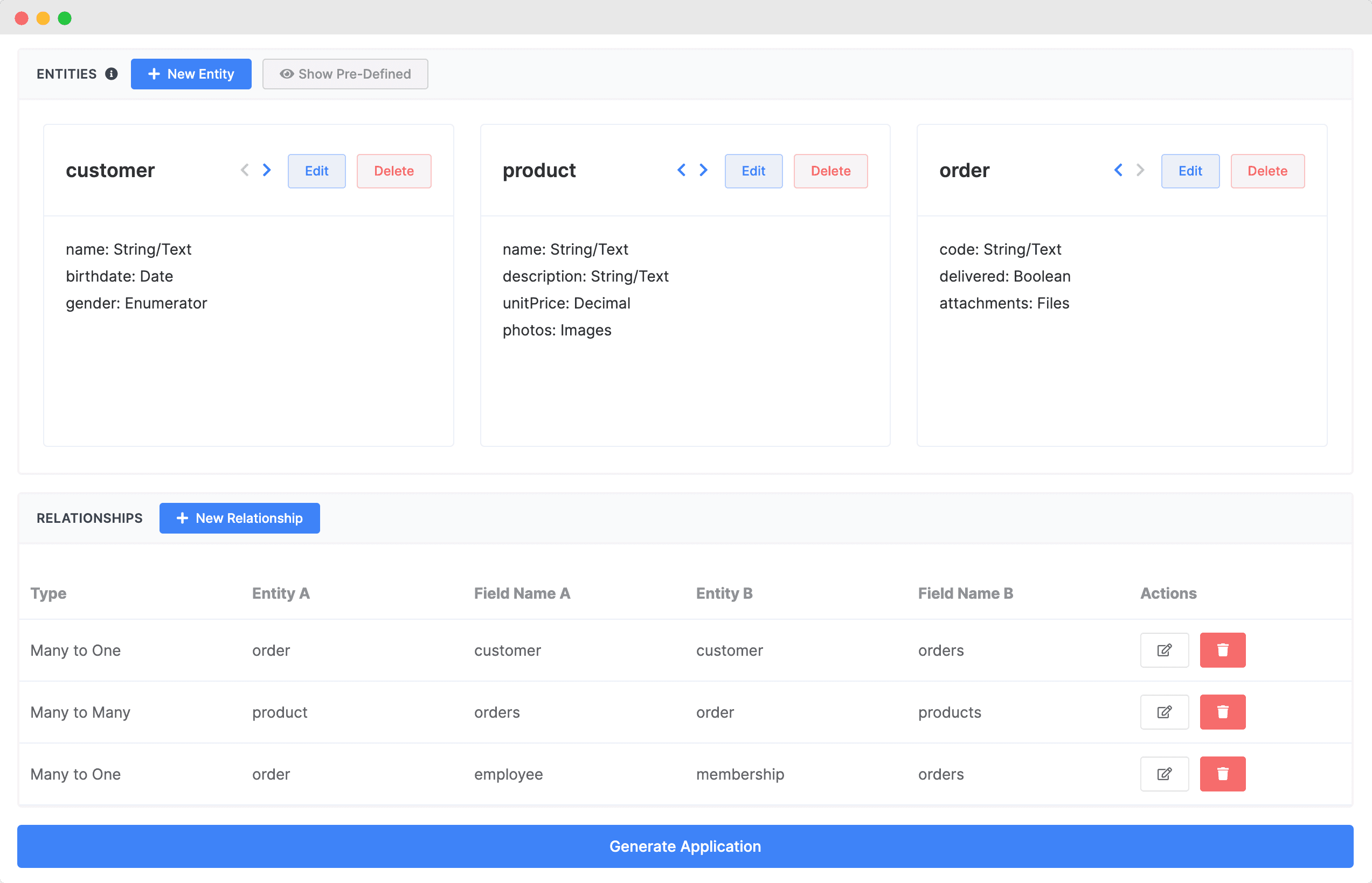 Model the application exactly how you need it, with custom entities, relationships, fields, and validations.